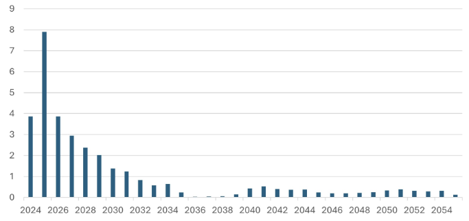 Let’s refocus on the US Treasury market, where the 10-year yield has traded in a volatile 4.2%–4.5% range. Yields spiked more than 100bps post the April tariff announcement, highlighting how vulnerable bonds are to policy surprises. But beyond short-term noise, what is even more concerning is the medium-term backdrop, which remains troubling. A towering wall of issuances looms—Treasury refinancing needs in 2025 will be more than double those of 2024 (Chart 1).