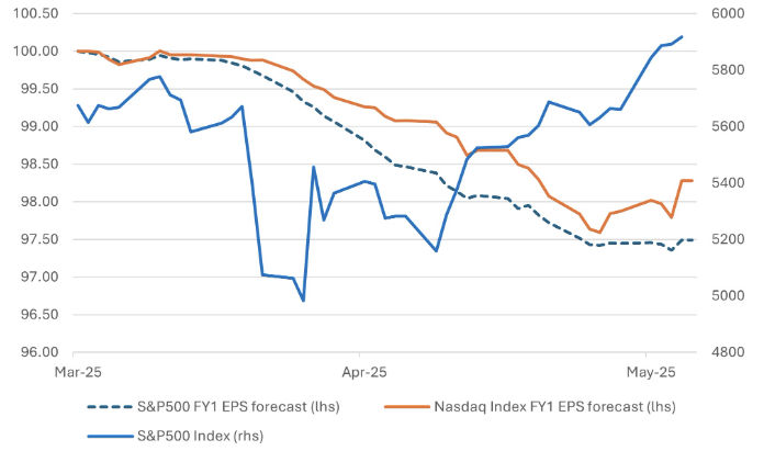 The bilateral agreement between the US and China to substantially reduce slated tariffs, at least for the next 90 days helped the S&P500 to complete its rebound from its lows to end the week slightly positive year-to-date. The rally is particularly striking given that analysts have been revising earnings forecasts downward. That said, the most recent revisions have edged modestly higher—perhaps reflecting relief that still, the proposed tariff hikes—ranging from 10% to 30%—remain on the table and could significantly undermine corporate profitability if enacted. Our review of the S&P 500 found few instances where share prices have underperformed changes in earnings outlooks, suggesting markets remain remarkably resilient—or complacent.