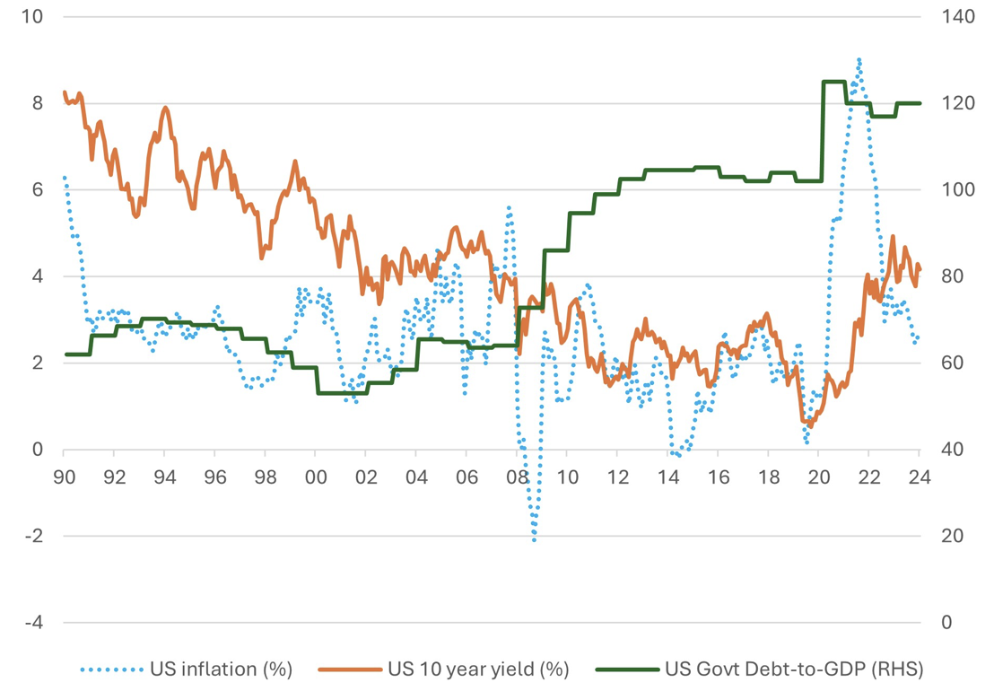 We would like to remind investors here that in the 1990s, when US inflation averaged around 2.7%, the 10-year Treasury yield reached as high as 6%. At that time, the US government debt-to-GDP ratio was only half of what it is today. Now, the US faces an undesirable combination of persistently high inflation and record levels of government debt, highlighting the challenges ahead for both policymakers and markets.