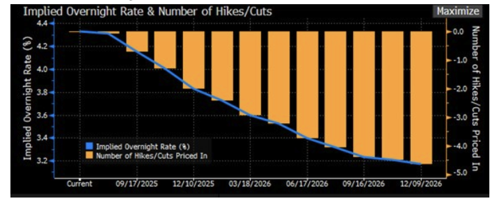 The debate about the shape of future Fed policy continues. Last week, President Trump called for an aggressive 300-basis-point rate cut “as soon as possible,” arguing that US monetary policy is too restrictive. In contrast, JPMorgan Chase CEO Jamie Dimon warned markets to prepare for the possibility of a rate hike, citing persistent inflationary risks and policy misjudgments. Currently, markets are pricing in two 25-bp rate cuts by the October meeting—although the probability of those cuts has declined over the last two weeks, as stronger data and hawkish Fed commentary have tempered expectations.