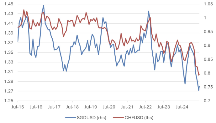Whether or not the US recovery continues, or whether currencies like sterling, the euro, or the yen become more attractive relative to the dollar, one clear trend is emerging—as we have noted earlier in this commentary, investors and central bankers alike are increasingly seeking ways to hedge their US dollar exposure or find alternative reserve currencies and asset classes. In this context, the conversation is increasingly turning toward so-called “hard currencies.” Two currencies stand out: the Swiss franc and the Singapore dollar. Both have historically outperformed the dollar, even during the greenback’s sustained bull run from 2009 through 2023.