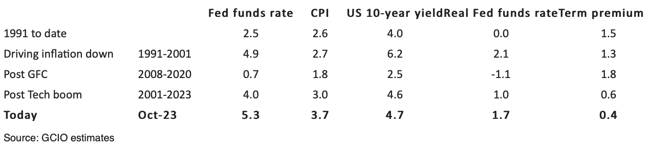 Analysing the monetary policy trajectory since 1991, we see that interest rates are substantially higher today than they have been on average since 1991. Inflation too is well above the average seen during this period. It then begs the questions as to why the 10-year bond yield is not already substantially higher. Today’s term premium for the US 10-year at 40bps looks too low. The average of most periods has been well above 100bps.