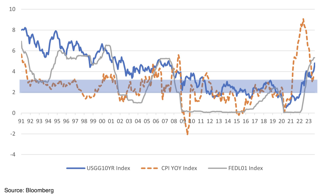 As we analyse the scenario that is unfolding today, we need to go back a bit in time. From 1991 to 2001 the Fed was actively driving down inflation. Over that period, the US 10-year yield averaged 6.2% while inflation averaged (just) 2.7%. Part of the reason for the higher long-term interest rates back then was that the Fed had only just begun building its credibility in beating down inflation. Investors also had an inflation mindset. Cut to today and investors have the benefit of anchoring their views on the dark days of the COVID-19 pandemic and the low inflation in the wake of the global financial crisis.