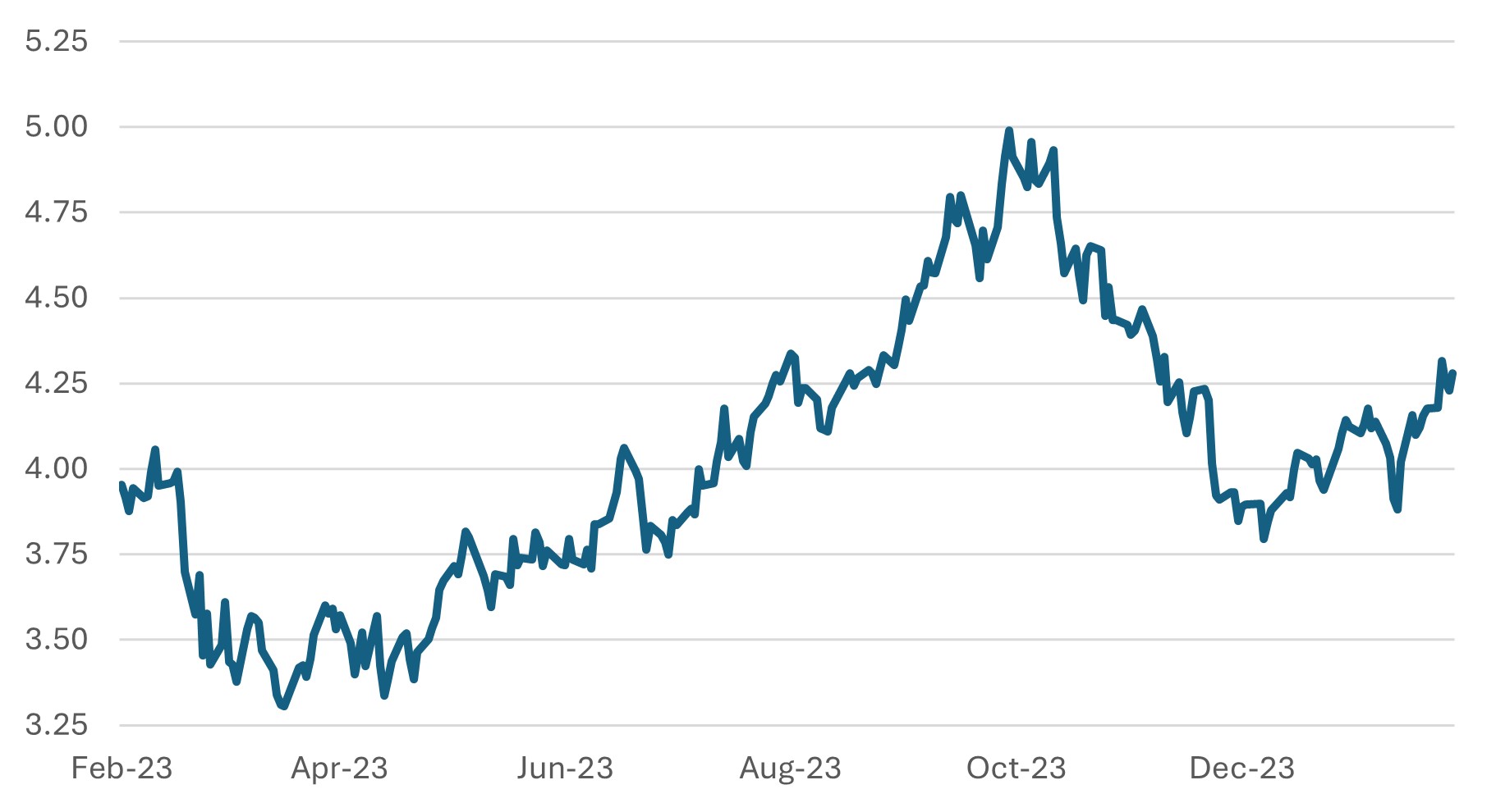 The trend in the US 10-year bond yield is instructive. From its December 27 low, with some volatility, the yield has been trending higher. The stickiness of inflation is quite apparent to the market. Also, the much-reduced market expectation of a March rate cut has taken its toll on the yield curve. We believe that a yield of 4.0% is around fair value for the US 10 year.