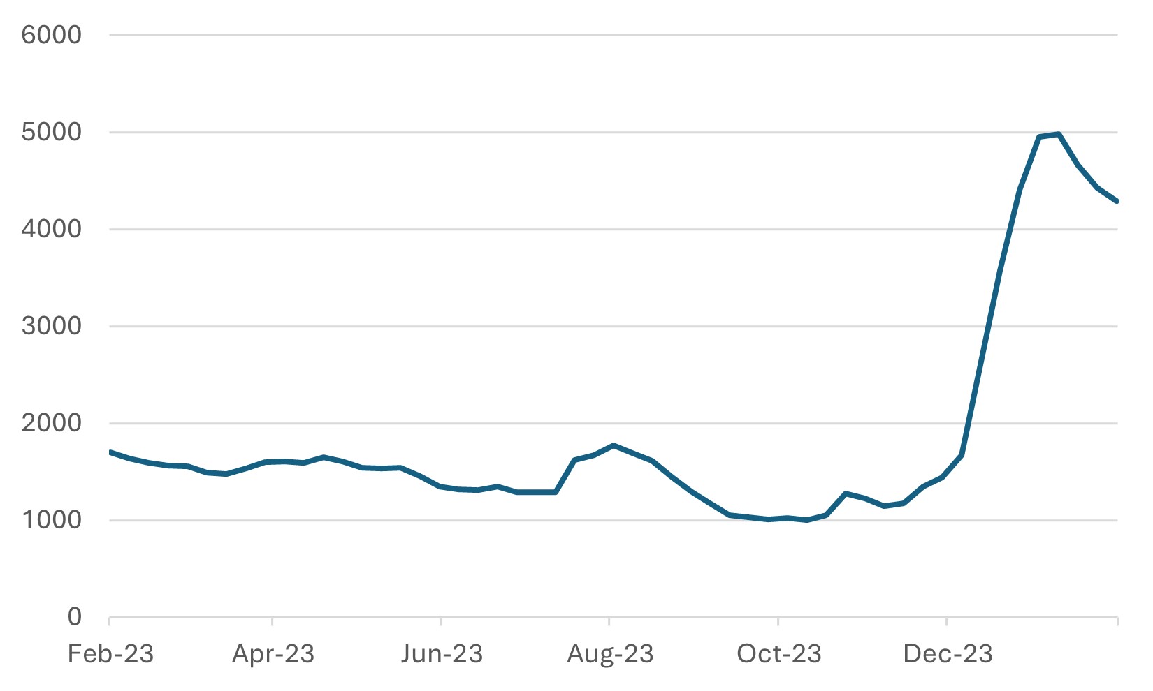 5. Houthi attacks on Red Sea continued with another ship hit by a missile, however, total attacks have declined, allowing for some reduction in the risk premium on freight rates (Chart 5).