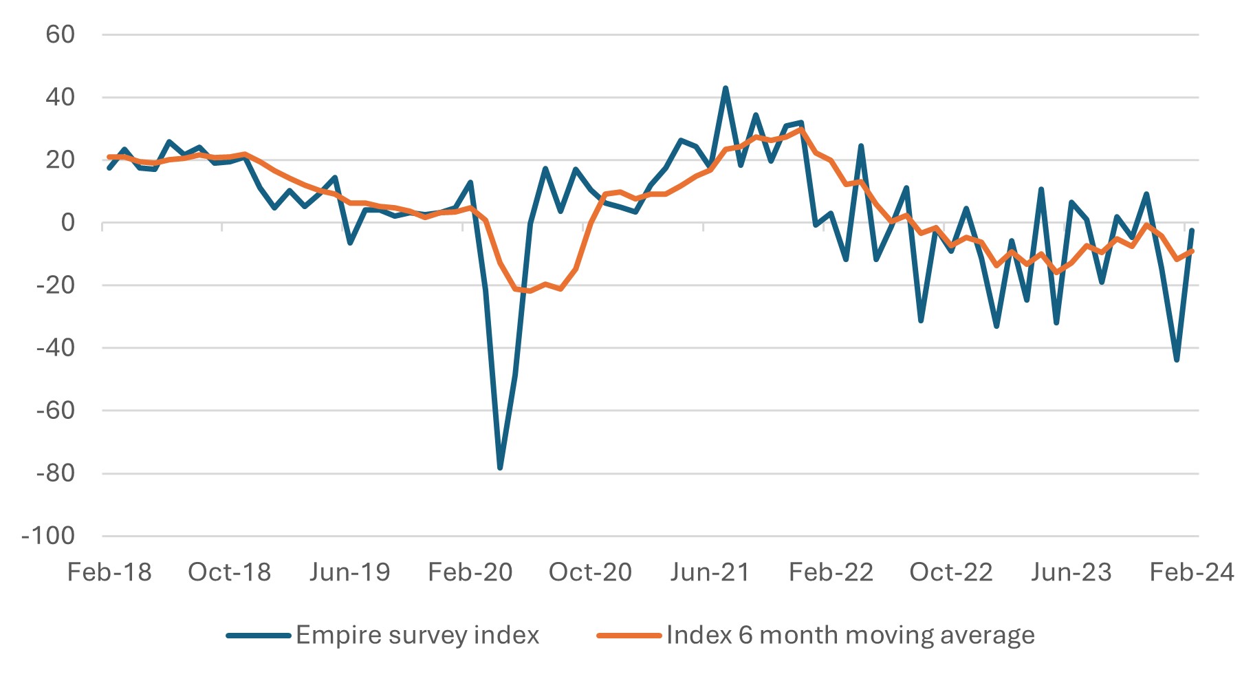 Our current assessment suggests that June could be the most probable window for a US rate cut. However, this forecast hinges on two critical conditions: a softening in inflation rates and a slight downturn in the job market. Economists are currently grappling with the uncertainty surrounding the actual pace of economic growth, as suggested by recent data releases. Up until a point, indicators were signalling a GDP growth rate for the quarter, annualizing at approximately 3.5%. Yet, the latest economic figures, particularly concerning US retail sales and industrial production, have shown weakness, partly attributed to adverse weather conditions in January. It’s noteworthy that even official sources acknowledged the potential negative impact of the inclement weather on these figures. Despite this, survey data has shown resilience, with the recent New York area survey bouncing back from a significant low in January to levels above the trend (Chart 2).