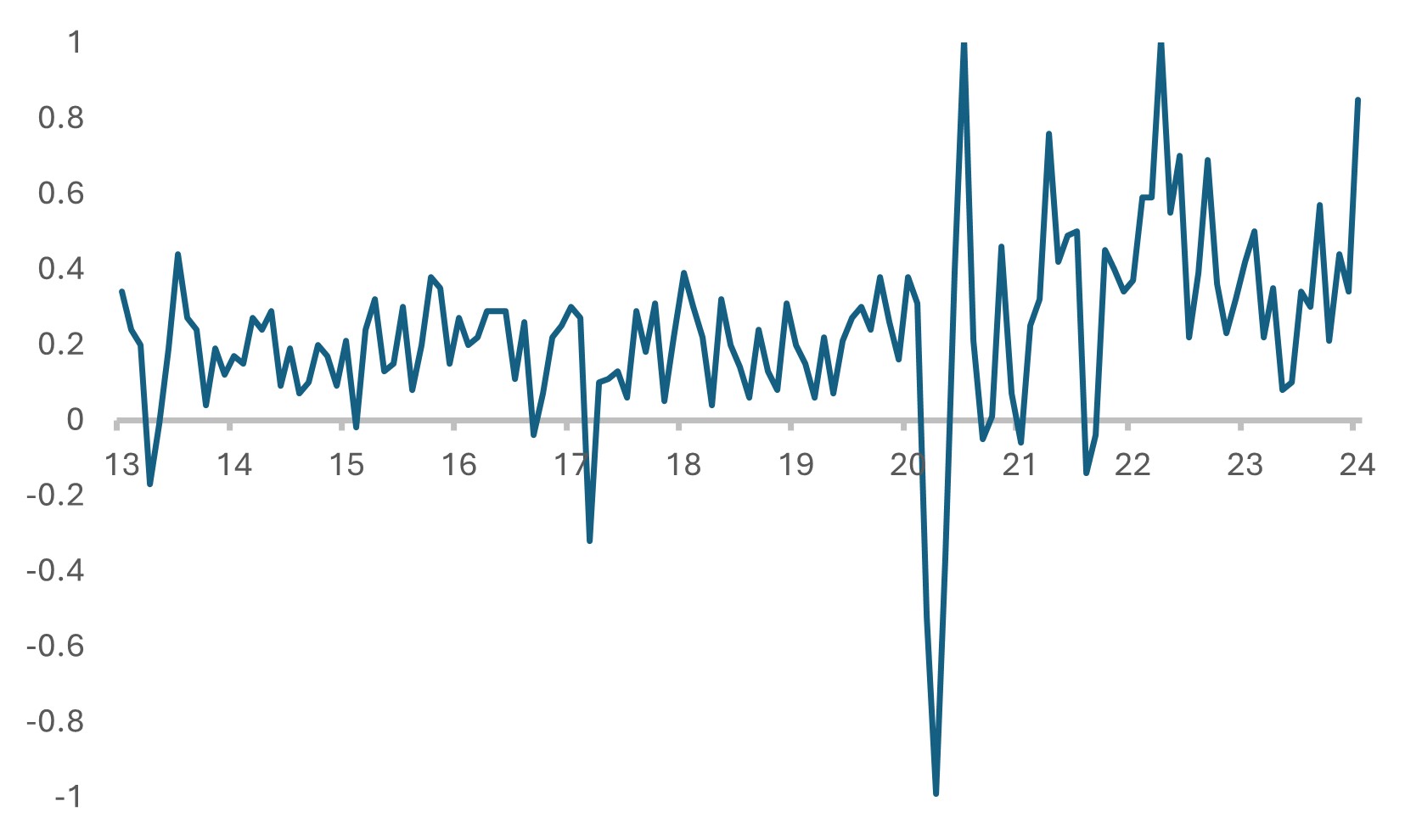 Chart 1: US ‘Super Core’ Inflation Month-on-Month – One of the Highest Readings