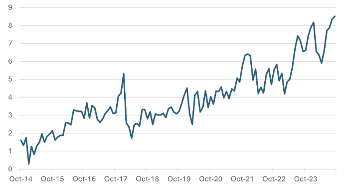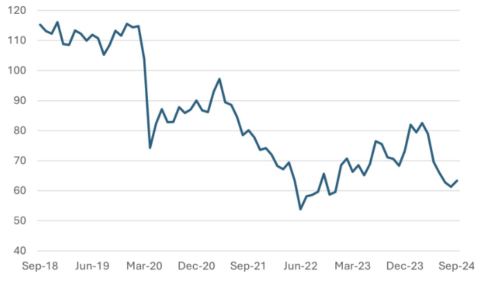 While the US equity market continues to push higher, the economic backdrop remains mixed. Data released last week showed that the Conference Board Consumer Confidence Index dropped to 98.7 in September, with the “present situation” sub-index declining sharply, indicating a potential economic downturn. Historical evidence suggests that a 20% decline in the current situation sub-index often precedes a recession. The ratio of consumers finding it difficult to get a job has worsened, predicting a rise in unemployment to 5.3% and signalling labour market pressure.