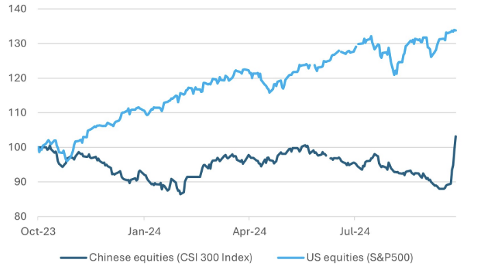 China has been front and centre of the past week’s global equity market action. It will suffice to say that the Chinese authorities are doing everything that they said they wouldn’t do. The helicopter money, and the support to the real estate sector, for instance, reverses their previous plans of fiscal discipline and real estate sector reset. But the leadership has certainly caved in to economic and, probably, political pressures and appears determined to generate the 5% annualised GDP growth that it is committed to. To be honest, China is only following the United States in spending money well beyond its means. The current P/E multiple of the CSI 300 is 14.9x, whereas the S&P 500’s is 25.6x. Now that the Chinese authorities want to create growth it’s probably best for the moment not to vote against further gains in the Chinese equity market.