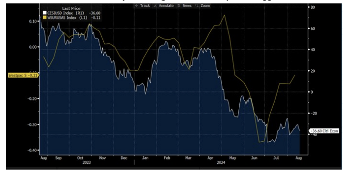 In explaining why the markets have regained their confidence in the US economic outlook, Bloomberg drew our attention to the chart below. The chart compares the Citi US economic surprise index and the Westpac US economic surprise. The difference between the two measures is that Westpac’s measure is more sensitive to whether the data is improving month-on-month rather than whether the data is above or below expectations. As the data shows, the two series tend to follow each other. However, on this occasion, the Westpac index has improved sharply, suggesting that despite the data coming in below expectations, the economy may be gaining momentum on an underlying basis.