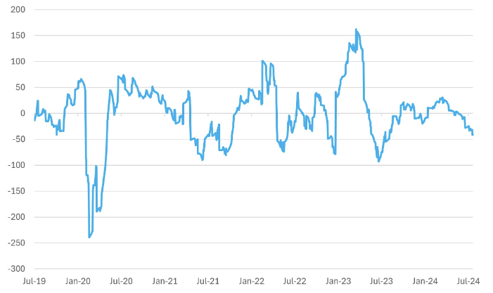 China’s economic surprise index shows us that things are bad; however, in the policymakers’ eyes the current disappointments may not be a precursor to a crisis. Indeed, a level for the index of -41.0 is not a crisis when measured against the lows of around -100, almost ordinarily seen since the recovery from COVID.