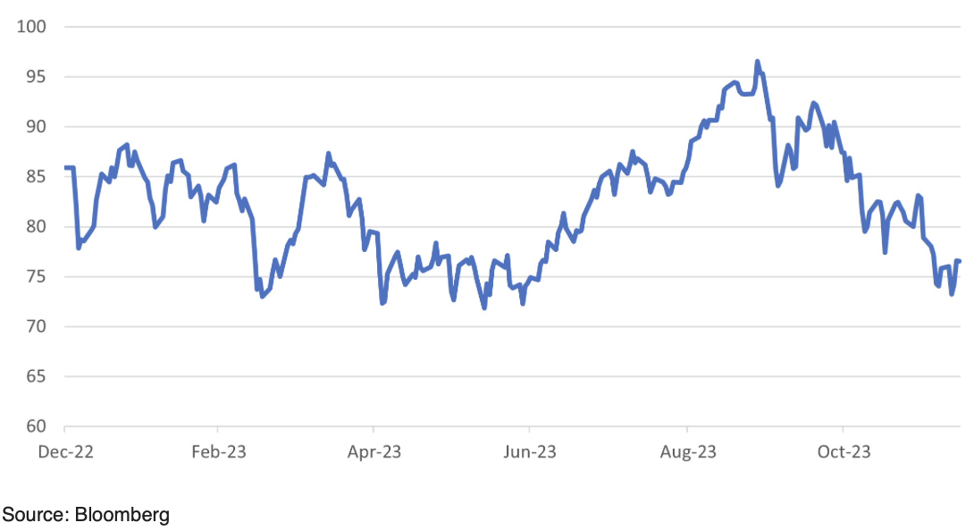Meanwhile, policymakers now appear more sanguine about the inflation outlook as the sharp drop in oil prices has helped tame inflation somewhat. Between September and October, oil prices zoomed to $96.5 amid escalating concerns about the military action in Gaza and worries that the conflict would spread. Oil prices have since tumbled almost 21% in two months, plunging to as low as 7% below their 200-day moving average – a true disinflationary force for good.