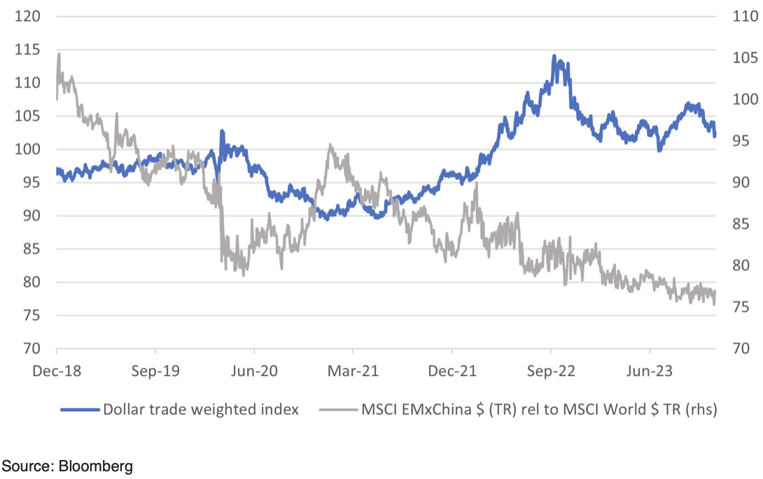 Chart 2: Relative performance of EM ex-China should get a boost from weakness of the dollar