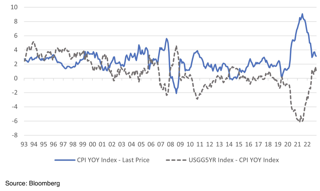 Take the US 5-year government bond as an example. Today’s real 5-year government bond yield is 1.1% based on the current headline inflation rate of 3.1%. The consensus forecast is that inflation will be down to 2.4% by the end of the year. Hence, a similar real yield would equate to a target yield of 3.5% for the 5-year bond compared with 3.9% today. Such a drop in yield provides an opportunity for an approximate 1.6% capital gain on the bond to enhance the return. Or you could stay in cash for a few months, accruing an annualised 5.25% yield!