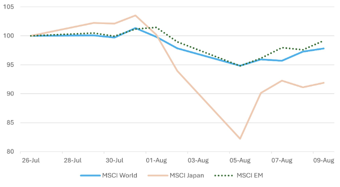 Global equites ended a 10-day rout, recovering almost half-way back to where they stood prior to the US employment report. Although Japan too has recovered around half of the losses, it is more substantially behind in percentage terms and probably offers a buying opportunity. Market sentiment has largely recovered although there will a legacy shock to the system which may make investors more discerning investors in crowded trades. We note the substantial outflows from non-investment grade bond funds and the tentative recovery in tech stocks.