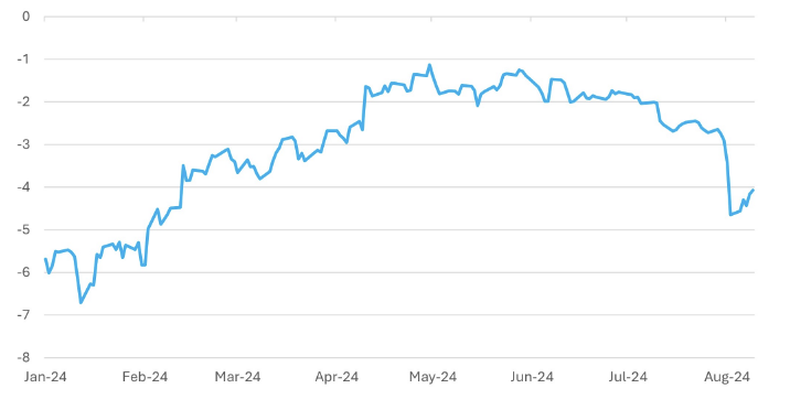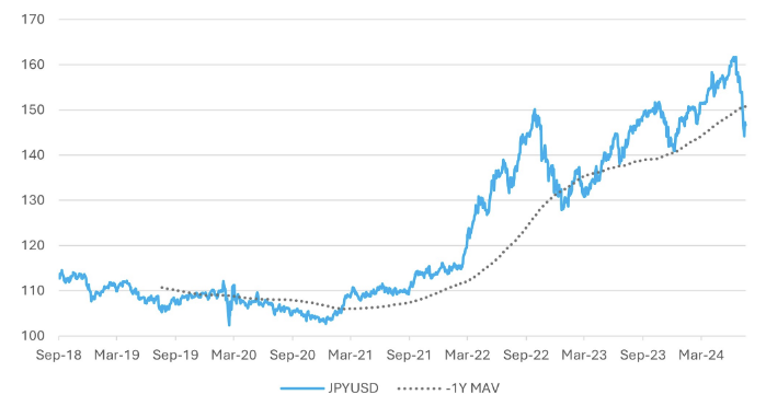 Let’s also address the carry trade. There was much speculation about the scale of the carry trade, which propelled the yen to some initial sharp weakness and some subsequent reversal. A growing consensus is that 75% of the carry trade has already been unwound (ref JPMorgan research). In any case, the yen has unwound a good amount of its most recent weakness, leaving it at a very competitive level relative to the average of the past five years.