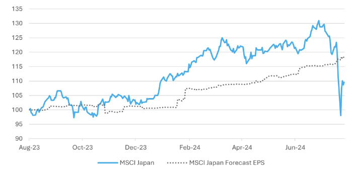 We also note that Japan is one of the few equity markets that has seen consistent analysts’ upgrades to corporate profit forecasts over the past 12 months. Indeed, 60% of Japanese companies have reported second-quarter results that have led to these upgrades. After the sell off, the market index appreciation over the past 12 months is below the appreciation in consensus earnings forecasts over the same period.