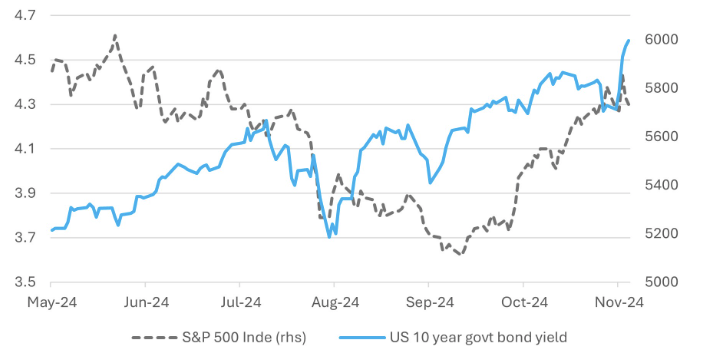 Risk markets are inclined to price in a positive outlook under President-elect Trump, as his core election promises—tax cuts, deregulation, and immigration reforms – could boost economic confidence. While the actual impact of these policies may take time to materialize, the sentiment could drive short-term optimism. Provided bond yields remain moderate, equities have potential for strong returns, with investors willing to pay premium valuations in anticipation of increased corporate earnings.