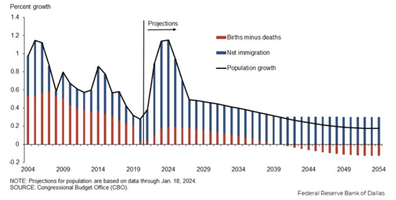 Longer term, tighter immigration norms could hurt the US’s potential GDP growth. Economic growth is fundamentally driven by workforce expansion; with an aging population and lower birth rates, the US is increasingly dependent on immigration to sustain its labour force. The underlying growth rate of the US population has halved since 2010, with the CBO projecting that number to fall to zero by 2040. In short, immigration is essential to the US economy, as it provides the labour force the necessary impetus for advancing economic expansion.