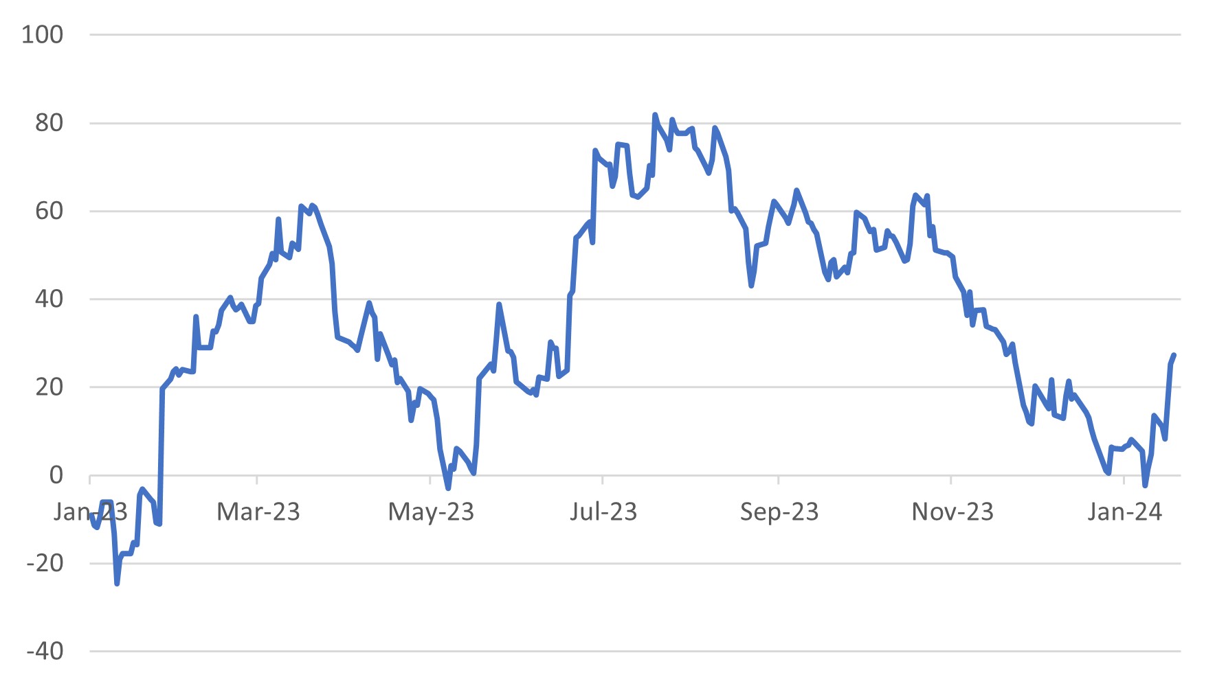 U.S. economic indicators continue to trend positively. As we had noted in our previous issue, the decline in inflation, driven by falling oil prices, has put more money in the hands of consumers, sparking a notable increase in spending. The U.S. Economic Surprise Index has seen a rebound in recent weeks, dispelling earlier concerns about a recession. A key highlight was Thursday’s Q4 GDP report, which significantly exceeded forecasts with an annualized quarterly growth of 3.3%, surpassing the consensus estimate of 2.0%. While this growth rate was partly inflated by inventory accumulation, the underlying figures remain robust nonetheless.