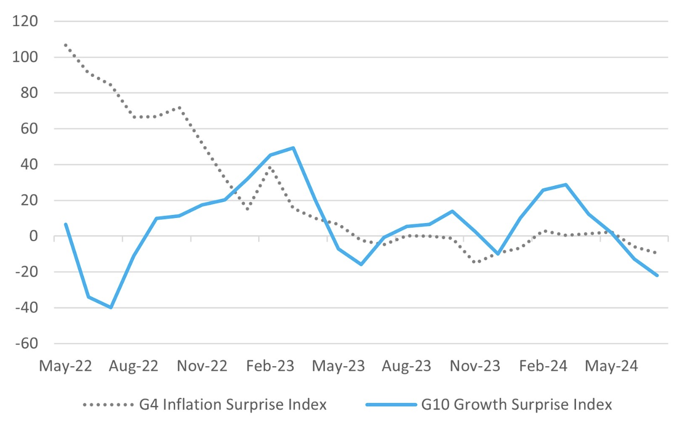 The global growth and inflation surprise indices have moved negatively in recent months. The US appears to have hit a phase of much slower growth, although coming off the back of a second-quarter GDP growth rate of 2.8%, although that growth may have been inflated by a build-up in inventories that may unwind in subsequent quarters.