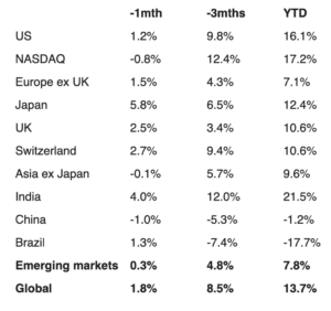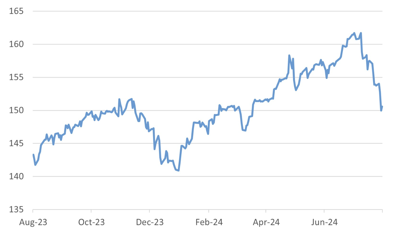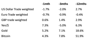 The feature of the month was the sharp rally in the Yen. Ongoing geopolitical issues, particularly in the Middle East, have led to a further rise in gold and bitcoin. Increased expectations of lower US rates reinforced the rise in the gold price and, as we saw in July, a weaker dollar.