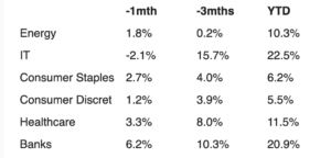 There was quite a switch of money flows into interest rate-sensitive stocks. Banks performed well, continuing the good absolute gains seen over the past year.