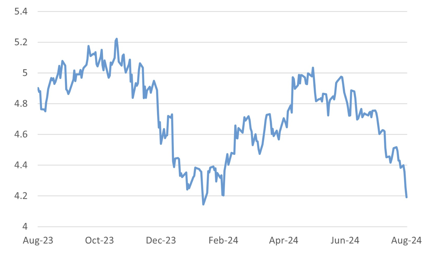 The slowdown in the US economy was most apparent in the labour market, where new jobs rose only 206,000 in July, and the unemployment rate picked up to 4.1%. The Fed has noted the more rapid pace at which the economy is moving to its targets for the looseness of the labour market and the moderation of inflation.