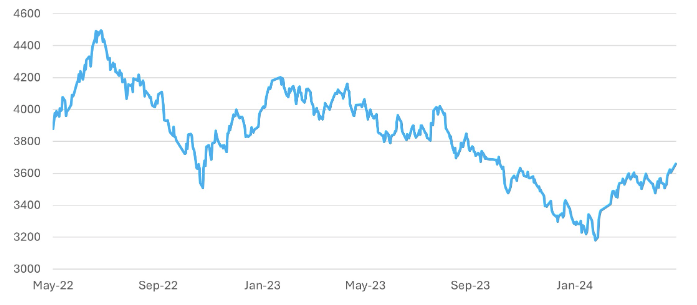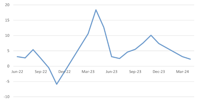 China has in the past month disappointed on economic data releases with the economy seeming to stall after recent better news. Economists are now looking to major government policy meetings coming up in July for another wave of support for the economy. The major challenge appears to be household confidence. Retail sales growth has fallen back from 10% year-on-year growth in November 2023 to just 2.3% in April.