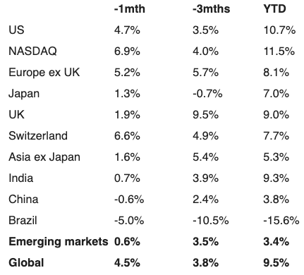 Equity markets were very healthy in May, nearly doubling the year-to-date returns in many cases. European equity markets managed to edge out the US. Europe benefitted from greater investors’ convictions that the ECB would be one of the first major central banks to cut interest rates. The good US equity market return was helped by the strong performance of tech stocks.