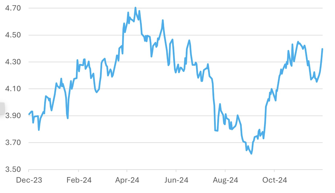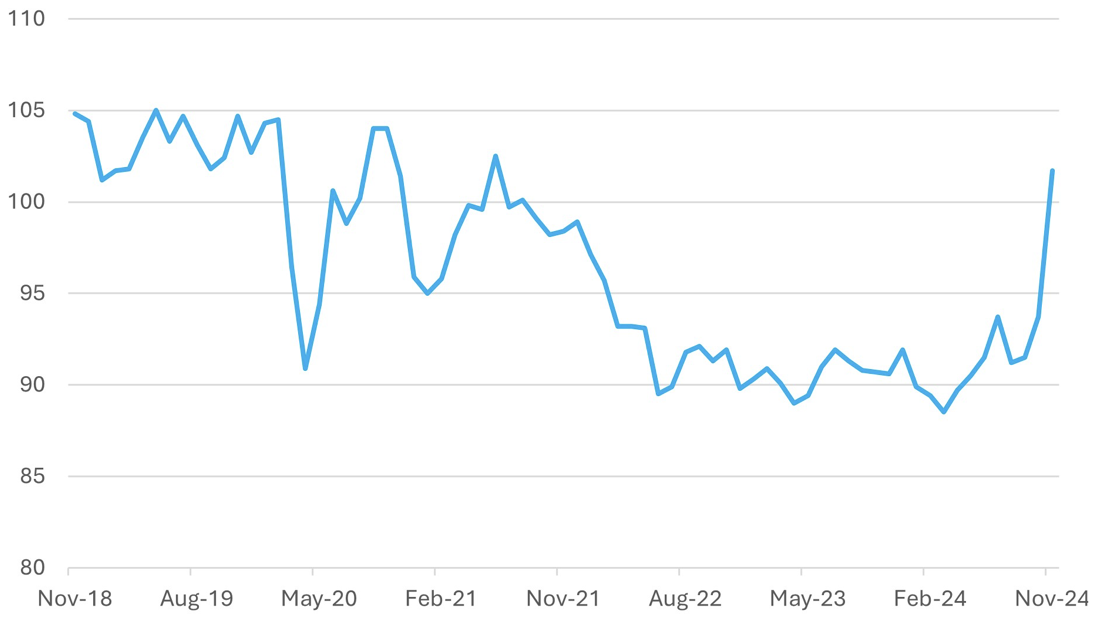We’ve discussed the likely boost to economic confidence in the United States following Donald Trump’s re-election. This optimism was evident in the latest NFIB Small Business Survey, which surged to a 3.5-year high. While this rebound might primarily reflect improved sentiment rather than tangible economic activity, it sets the stage for a potential period of robust growth as the new year begins. A sharp rise in confidence typically translates into increased business activity.