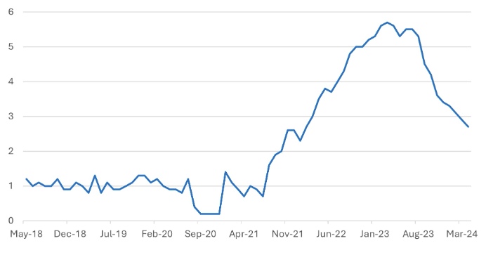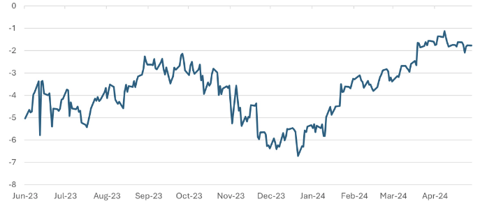In Japan, the much weaker-than-expected GDP data challenged the hopes that the economy was on a path to consistent growth. First-quarter GDP fell 2.0% quarter-on-quarter, with the estimates for the fourth quarter of 2023 also revised down to 0% from 0.4%. Despite a good increase in household incomes, consumers still lack the confidence to spend. It was also unsettling to see a 3.2% quarter-on-quarter fall in capital investment, although this drop is after a very strong 7.4% increase in the fourth quarter.