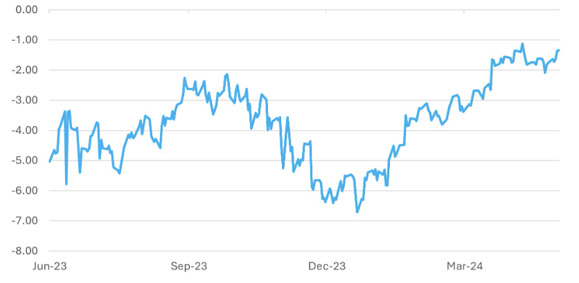 The Conservatives’ chances of returning to government look dire indeed. The Economist magazine’s model has the party’s probability of winning the most significant number of seats (but still short of a majority) is at 1%. The widely expected outcome is that Labour will return to power after 14 years with a working majority. Investors cry out for a stable governing majority with a clear mandate. As likely, Sir Keir Starmer, the Labour Party leader and the likely prime minister, is taking a cautious line in framing the election manifesto – commitments on workers’ rights, for instance, have already been diluted to quell business concerns. A majority of more than 60 seats looks like a hard ask, but Scotland will be crucial. Here, Labour looks to be the primary beneficiary of the collapse in popularity of the Scottish Nationalist Party. So far, at least, sterling has remained steady. The more interesting topic is any potential for a long-awaited re-rating of the local stock market post-election.