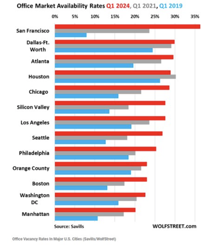 The bifurcated market in the US is particularly evident in the newsflow from the property sector. While the tech sector is enjoying upgrades to profit forecasts, the real estate market is facing serious headwinds. The latest data for commercial real estate shows further increases in US commercial real estate vacancy rates in major cities. In fact, only in Houston has the occupancy rate increased over the past year.