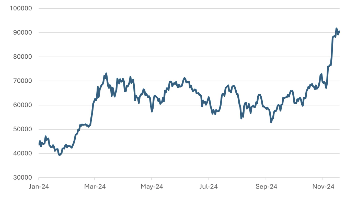 Notably, the US dollar strengthened, with the trade-weighted dollar index up 3.2%, as markets priced in a tighter monetary policy in response to the anticipated fiscal stimulus. Bitcoin, often considered a hedge against macroeconomic instability, emerged as a standout winner, with a 30.6% return since November 5. This rally can be attributed to two key factors: growing interest of investors seeking diversification towards digital assets and a perception that the incoming administration might adopt a more favourable stance on cryptocurrencies.