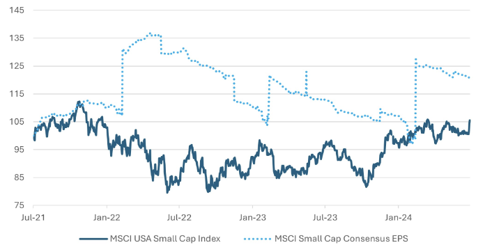 The equity markets have rallied in response, with old economy stocks outperforming tech, and small-cap indices showing significant improvements. For example, the MSCI US small cap index, which had been flat over the past three years, saw a sharp rally last Friday, suggesting further upside potential. Over the past four years, the small cap index has seen a drop in valuation; although the earnings index for small caps has risen 20%, the index has returned very little. In our view, there is room here for a further run up in the small cap index to close the gap with earnings.