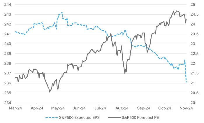 The US equity market, however, appears vulnerable in the near term. While some investors argue that a Trump victory could be beneficial for equities due to hopes of greater economic growth stimulus, current market valuations are considerably higher than in 2016, the year before Trump took office for the first time. Any substantial fiscal boost would likely take several quarters to pass through a divided Congress, which may delay its impact. Additionally, some market fundamentals, such as earnings revisions, are currently challenging. The third-quarter earnings season has delivered mixed results, with the S&P 500’s expected earnings level continuing to trend lower, a pattern observed throughout much of this year.