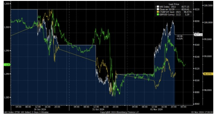 Chart 3: UK FTSE100 and UK 10-Year Bond Price and Sterling Initially Fall on UK Budget
