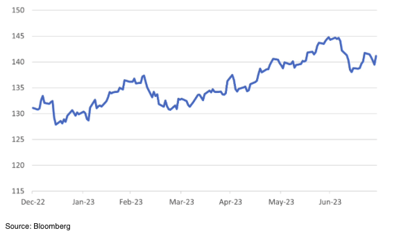 The market believes that recent data releases fit the much-discussed soft-landing scenario where growth remains robust, but inflation is waning. Last week’s PCE inflation data, a gauge that the Federal Reserve follows closely, was better than expected at 3.8% quarter-on-quarter annualised, although it was still way ahead of the Fed’s long-term inflation target of 2.0%. The stronger-than-expected growth data pushed the US 10-year government bond yield to 4.0%. Those who expect the 10-year government bond yield to drop back through the balance of the year predicate their forecast on views that the US economy will slip into a mild recession in the coming months. Data out recently, however, still show strong US growth soaking up spare resources.
