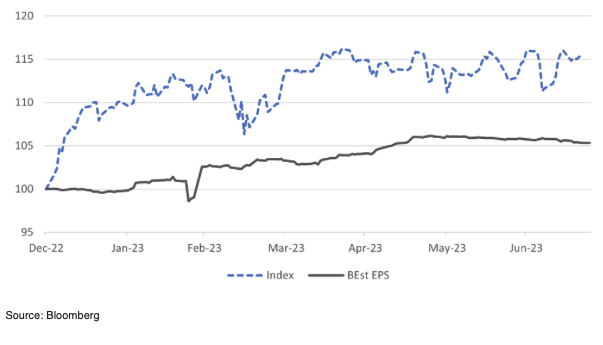 Eurostoxx index and Eurostoxx expected corporate profits rebased to Dec 22 =100