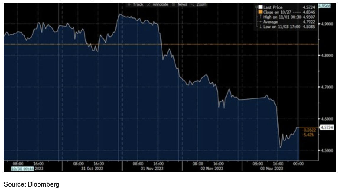 Chart 1: Intraday US 10-year government bond yield – Exceptional drop on the week