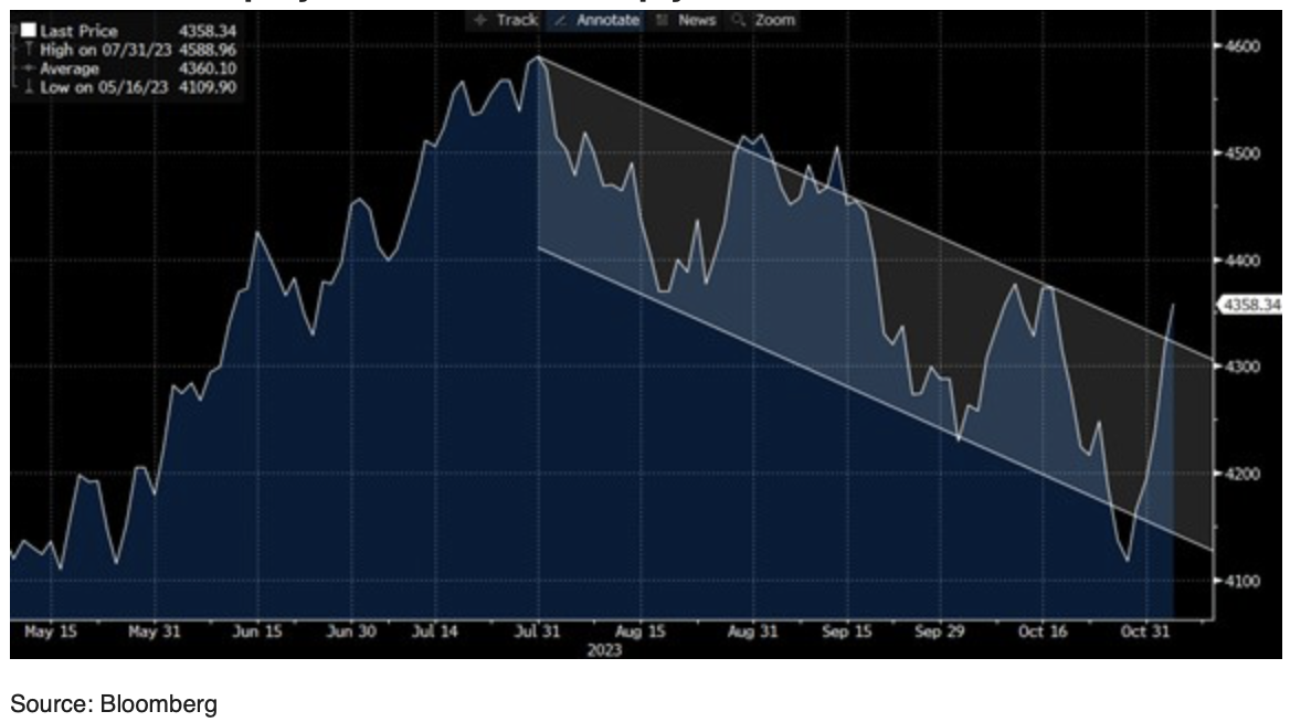 Last week’s rally in the US equity market was universal with 479 of the S&P 500 components recording gains on the week. The recent rally has seen the US equity market notch up gains of 5.9% since the 27 October close. But that is just one part of the dynamic. The important question is whether the market remains – for all intents and purposes – in the downward channel established since the end of July or whether we are close to the peak of a bear market rally?