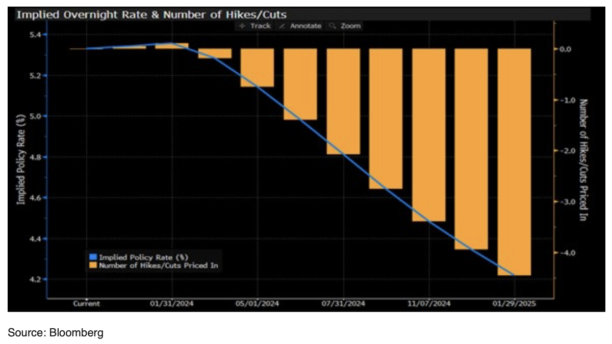 The market prices a first rate cut in the second quarter followed by three further cuts over the rest of 2024.