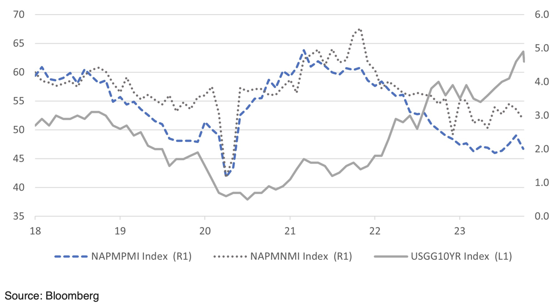 Both the ISM manufacturing sector survey and the ISM service sector survey signal that the GDP growth in Q4 could indeed falter somewhat. After the recent rebound in confidence for both the manufacturing sector and the service sector, the latest data for the month of October was worse than expected. It is interesting to note that the last time the manufacturing sector survey was at these levels the US 10-year yield was at 0.5% to 1.0%. Other than for the COVID crisis, and the recent noise in the economy, service sector confidence has not been at this level since 2010.