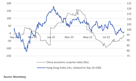 Despite the better news from China, Chinese equities drifted lower over the week after an initial knee-jerk recovery. In Hong Kong, the Hang Seng index has not shown any marked strength despite the improving economic data trends and remains 20% off its post-COVID high of January 2023. We suspect that foreign investors remain increasingly worried about the structural concerns plaguing the economy, namely the challenges in the property sector and fears of potentially less market-friendly policies from the current leadership. It was noticeable that Alibaba and JD.com, the two stocks that overseas investors have preferred previously, were down on the week. It is clear that unless an influx of domestic money happens, the market will remain depressed.