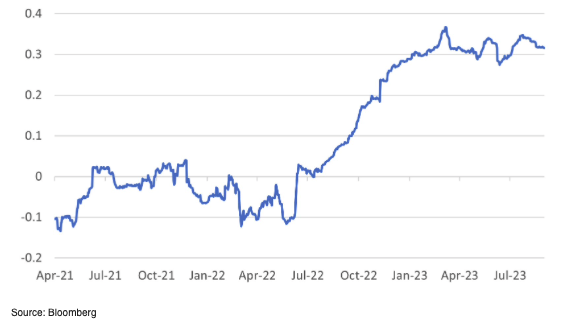 The market has moved to discount only a marginal risk of a further Fed funds rate increase and five rate cuts by the end of next year. In our view, the market is getting it wrong. Even as recently as the end of last week, the Federal Reserve Bank of Cleveland President Loretta Mester was perhaps only acknowledging the market’s predicament when she noted that US inflation remains too high, and the labour market is still strong. Mester is only one among many voices at the Fed, but it only highlights the widening gap between the Fed’s perception and the market’s hopes.