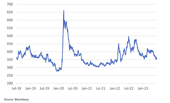 We believe that despite the recent good performance there is still an opportunity in emerging market debt. The emerging market debt index (EMBI) has already seen a good narrowing of the spreads over treasuries (Chart 1). The spread has dropped to 350bps from close to 500bps a year ago. However, over the past year the emerging market debt has shown its mettle with a lack of drama, in contrast to the woes of the small and medium-size US banks in the first quarter last year.