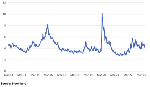 US Bond markets have been more circumspect than equities about the prospect of monetary tightening. One asset class to be wary of is high yield bonds. Defaults have started to inch up in recent months from 1.6% at the start of the year to 2.4% through May. Despite higher defaults US high yield spreads remain relatively low at 416bps. In our view spreads could easily widen out to 500-600bps. We advocate an underweight.